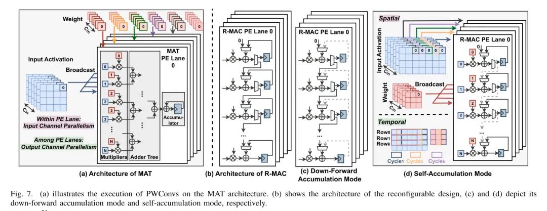 引擎处理DWConv时,首先将得到的输出结果减去在校准数据上获得的通道均值,以实现第IV-C节中引入的滤波器级移位,以便促进激活量化。之后,它们通过重新量化模块进行重新量化,然后存储在辅助缓冲区中。然后,它们迅速被引导到空闲的MAT引擎,作为后续PWConv计算的输入。鉴于DWConvs的计算量比PWConvs少,一旦完成当前DWConv的处理,R-MAC引擎可以重新分配,与MAT引擎一起参与PWConv的并发计算。