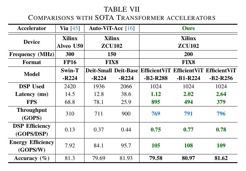 **的FPS,以及与专用ViT/DeiT加速器Auto-ViT-Acc [16]相比,实现