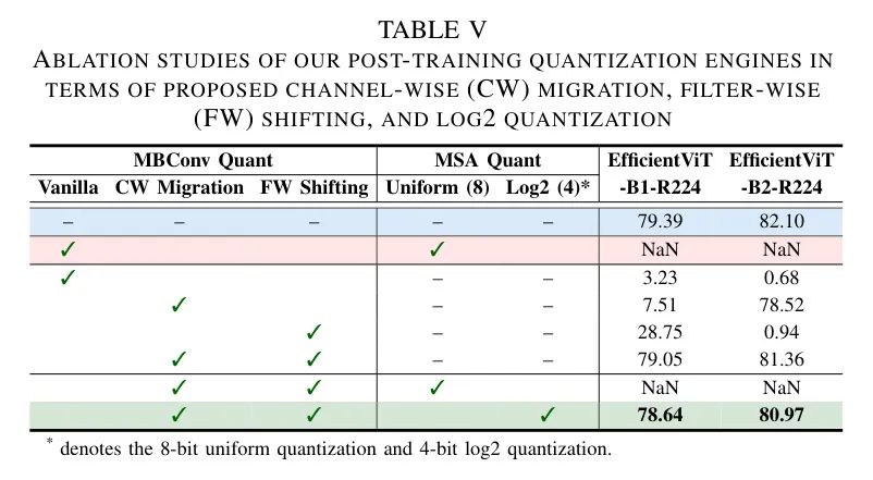 (ii) 通过结合作者提出的通道迁移和滤波器偏移,分别解决上述两个问题,两者都是不可或缺的,作者可以有效地量化MBConvs,平均准确度仅下降0.54%。在此基础上,关于轻量级MSA的量化,