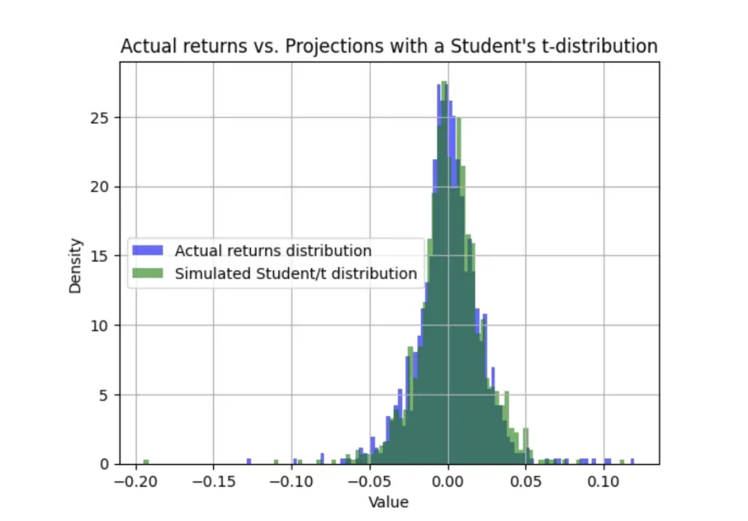 我们将使用这些参数来预测 Student-t 分布。然后,我们将用 Student-t 分布绘制实际股票收益分布图。
