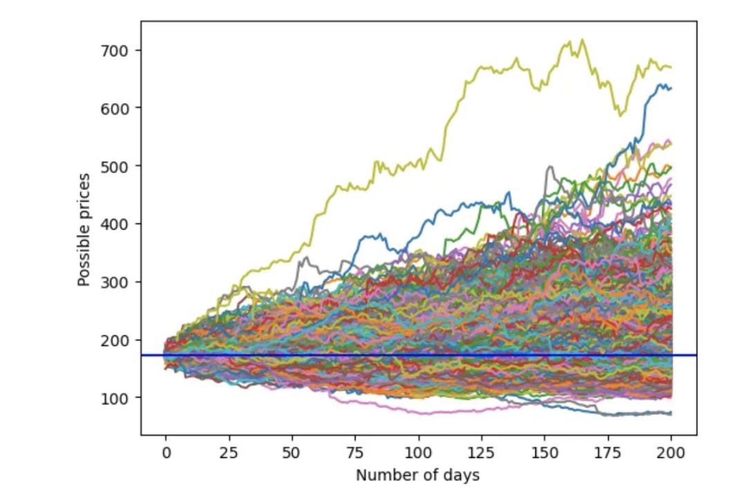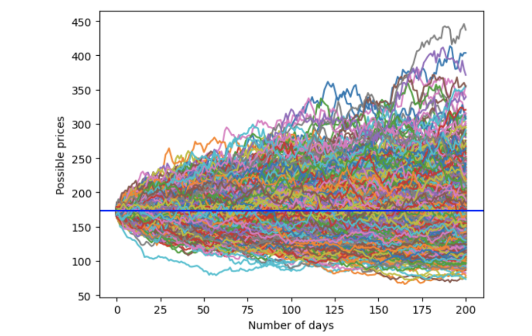 以上是股票价格和收益的基本财务公式。我们将使用蒙特卡洛模拟。为了预测明天的价格,我们可以随机抽取另一个收益率,从而推算后天的价格。通过这个过程,我们可以得出未来 200 天可能的价格走势之一。当然,这只是一种可能的价格路径。我们可以重复这个过程,得出另一条价格路径。我们将重复这个过程 1,000 次,得出 1,000 条价格路径。