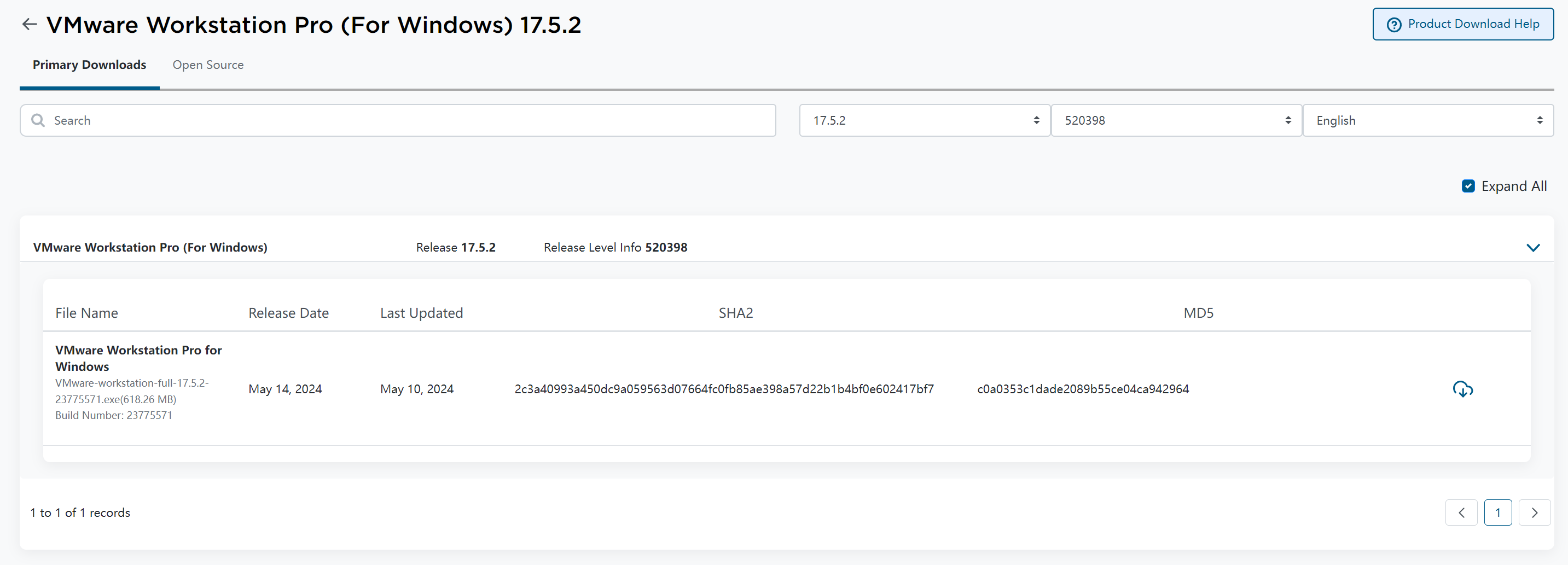 这里可以看到,VMware Workstation Pro for Windows 安装包【VMware-workstation-full-17.5.2-23775571.exe】大小为 618.26 MB 于5月10日更新。