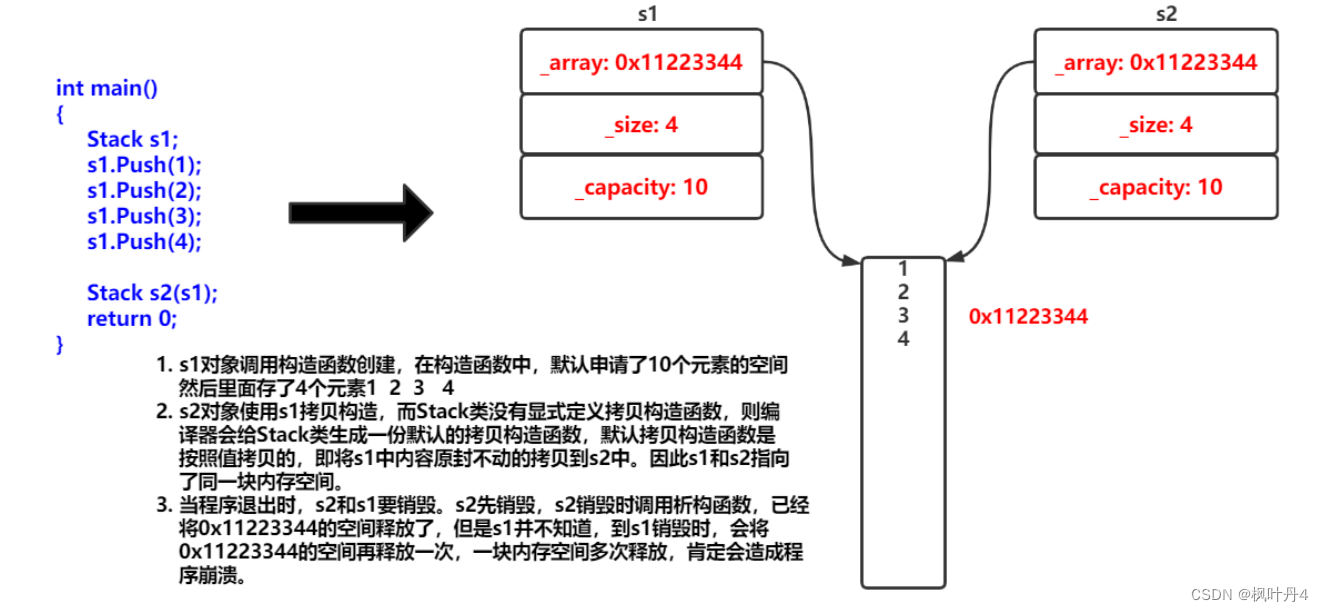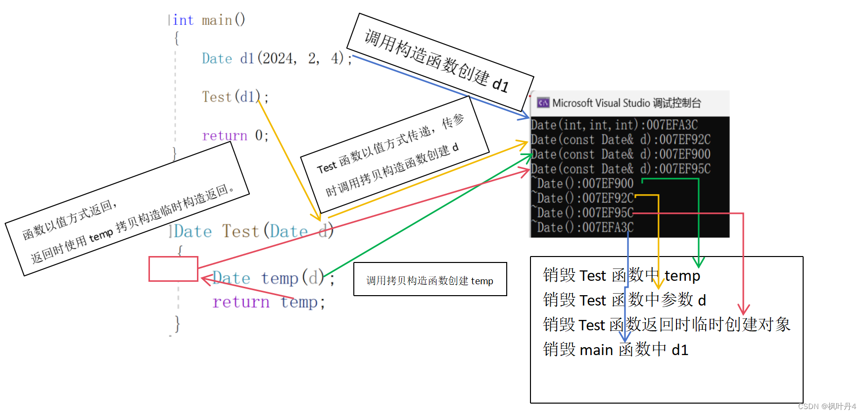 3. 一个类只能有一个析构函数。若未显式定义,系统会自动生成默认的析构函数。注意:析构函数不能重载;