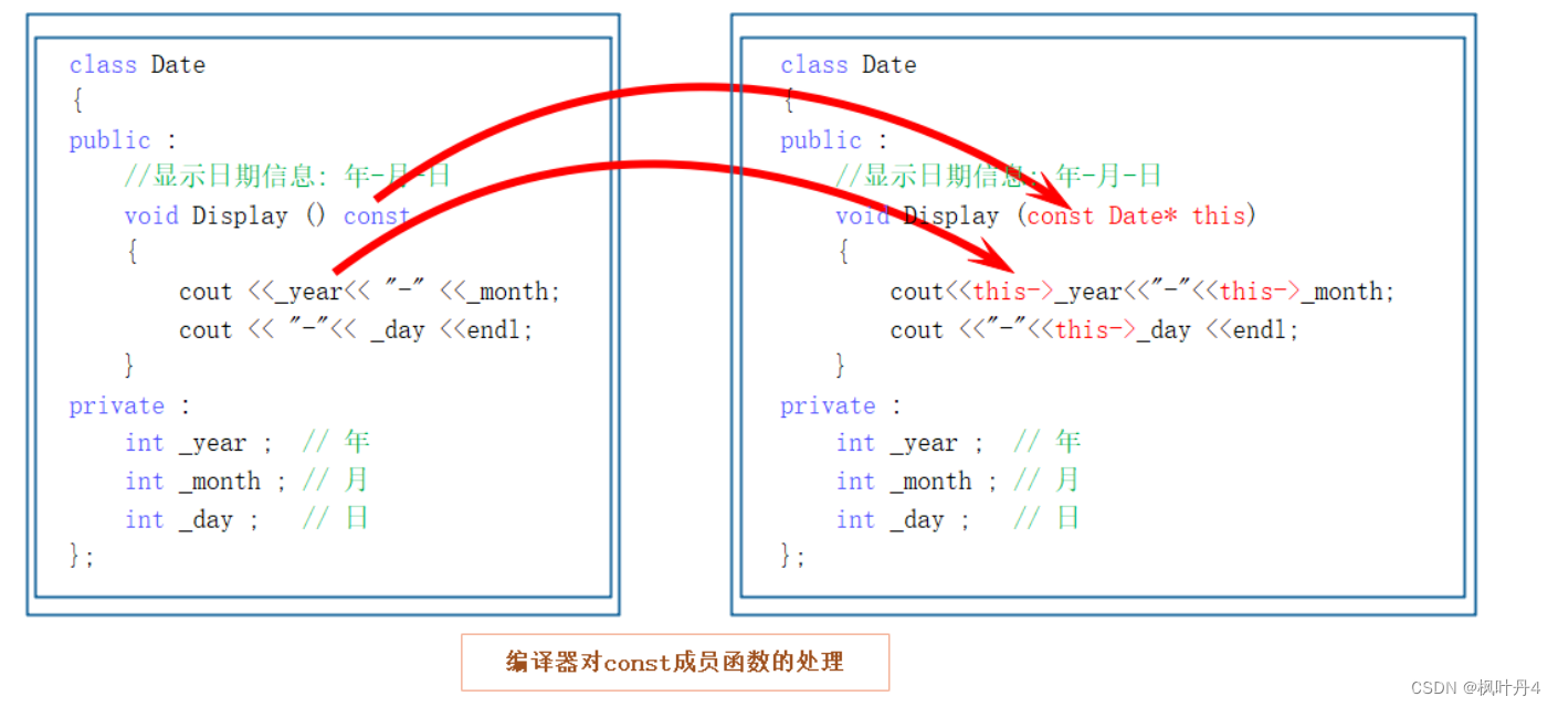};将const修饰的“成员函数”称之为const成员函数,const修饰类成员函数,实际修饰该成员函数