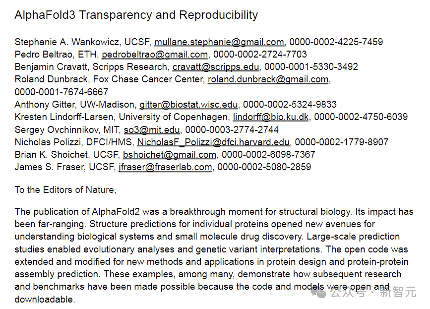 谷歌的AlphaFold3在5月9号登上Nature头版,而仅仅两天之后的5月11日,加州大学旧金山分校(University of California,San Francisco)的计算结构生物学家Stephanie Wankowicz,和其他九位科学家共同撰写了一封致Nature的公开信: