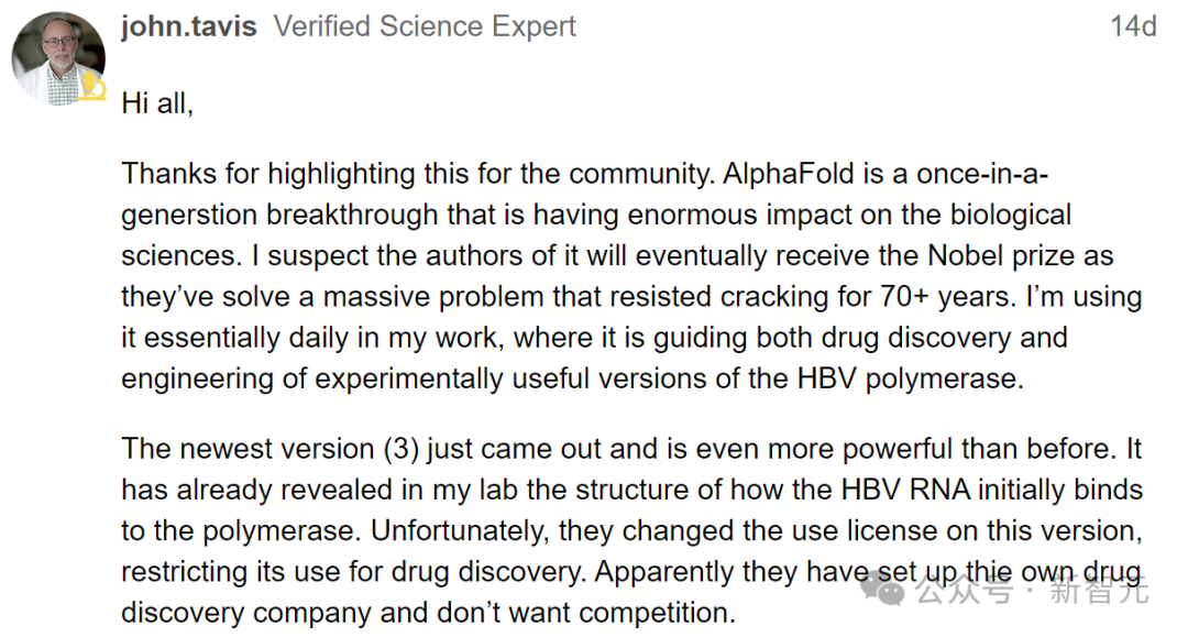AlphaFold是一项千载难逢的突破,对生物科学产生了巨大影响。我认为它的作者最终会获得诺贝尔奖,因为他们解决了一个70多年来一直无法破解的巨大问题。我基本上每天都在工作中使用它,指导药物发现和实验上有用的HBV聚合酶的工程设计。 最新版本的AlphaFold3比以前更强大。它已经在我的实验室中揭示了HBV RNA最初如何与聚合酶结合的结构。不幸的是,他们更改了此版本的使用许可,限制了其用于药物发现。