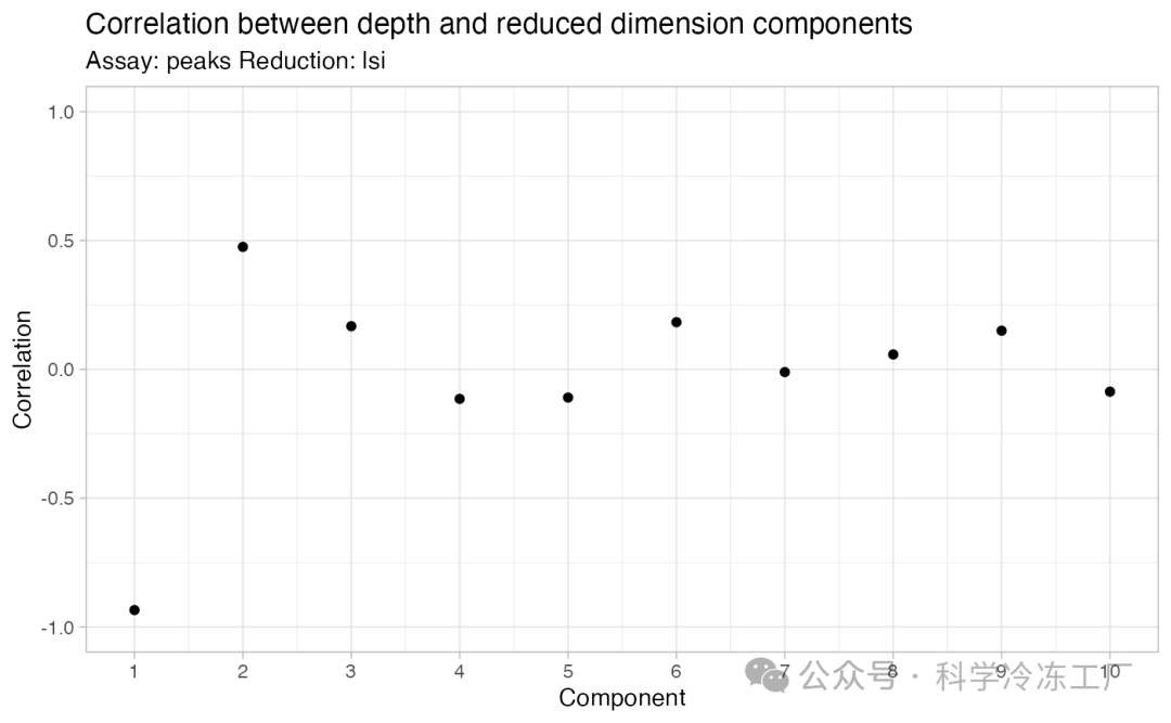 在分析中,LSI(线性判别分析)的第一个主成分往往反映的是测序的深度(即技术层面的变异),而非生物学上的变异。如果确实如此,那么在后续的分析中应该将这一成分排除掉。为了判断是否存在这种情况,我们可以通过调用DepthCor()函数来计算每个LSI主成分与测序深度之间的相关性。
