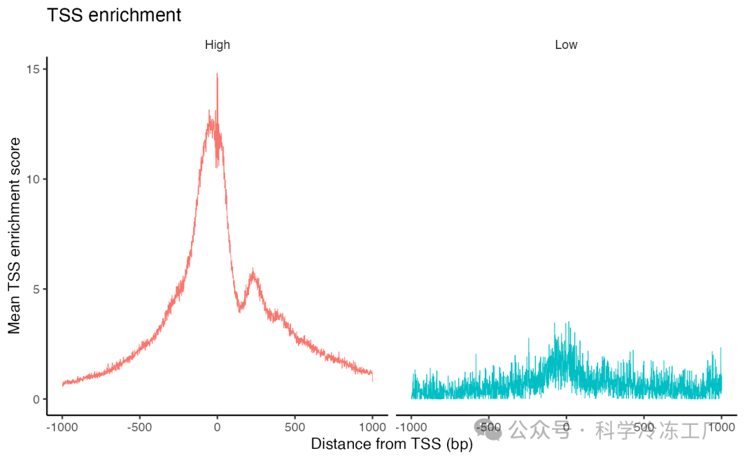 在ATAC-seq实验中,Tn5转座酶在转录起始位点(TSS)处的整合事件的富集程度,是一个关键的质量控制指标,用于评价Tn5的定位效率。ENCODE联盟将TSS富集分数定义为TSS周围Tn5整合位点的计数与这些位点在相邻区域计数的比率。在Signac软件包中,我们可以使用TSSEnrichment()函数来为每个细胞计算这一富集分数。