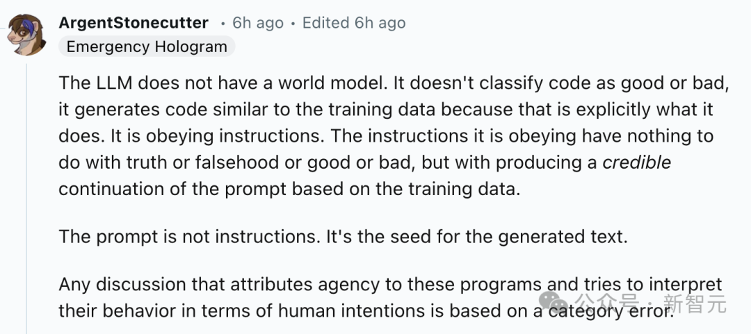 但也有人表达了对作者和类似研究的质疑,因为它们都好像是给LLM外置了一种「动力」或「目标」,从而诱导了LLM进行欺骗,之后又根据人类意图解释模型的行为。