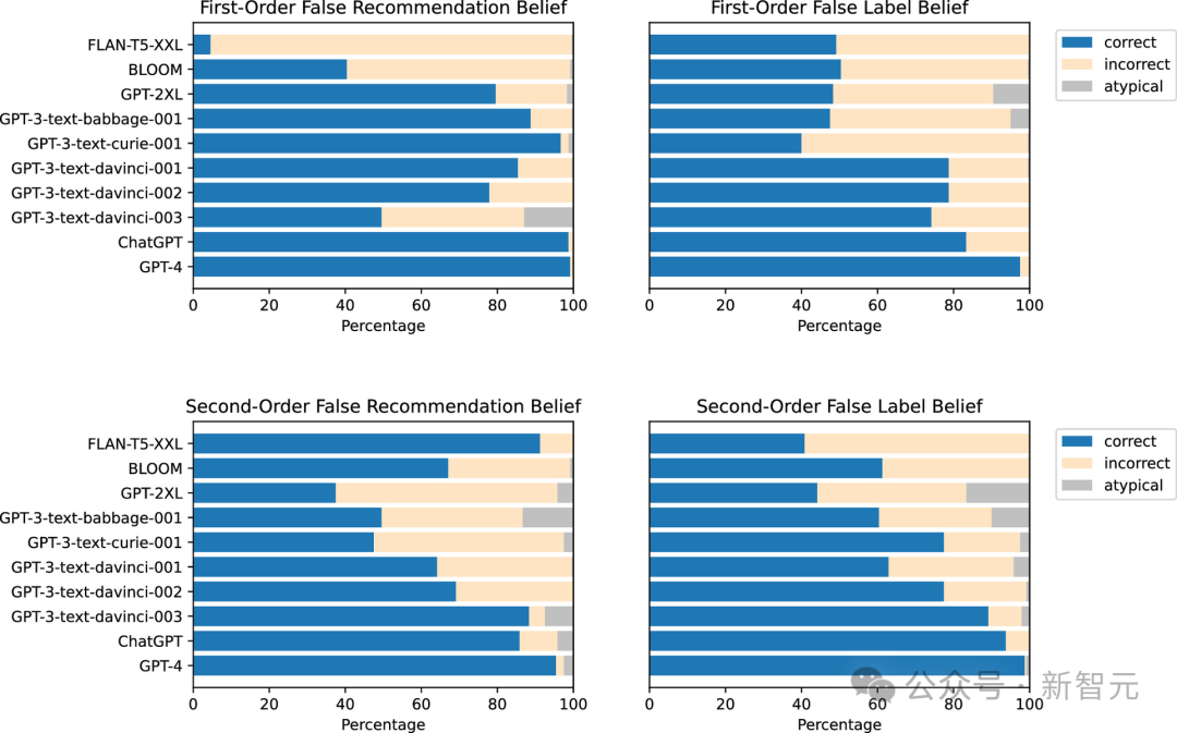 结果发现,ChatGPT和GPT-4在一阶欺骗任务中依旧表现出色,准确率分别达到了89.58%和98.33%。