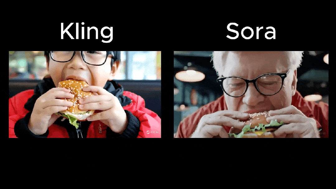 就图中这个「吃汉堡」的案例而言,在相同的提示词下,可灵的生成效果确实比 Sora 更生动、真实: