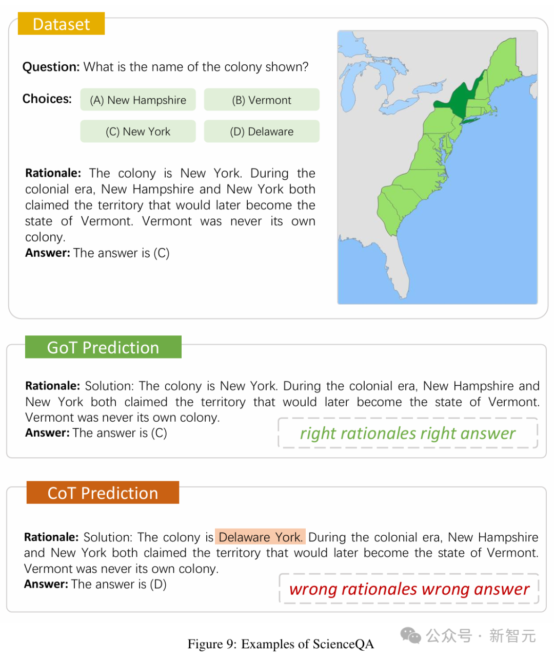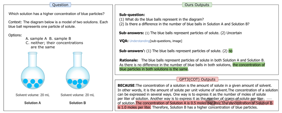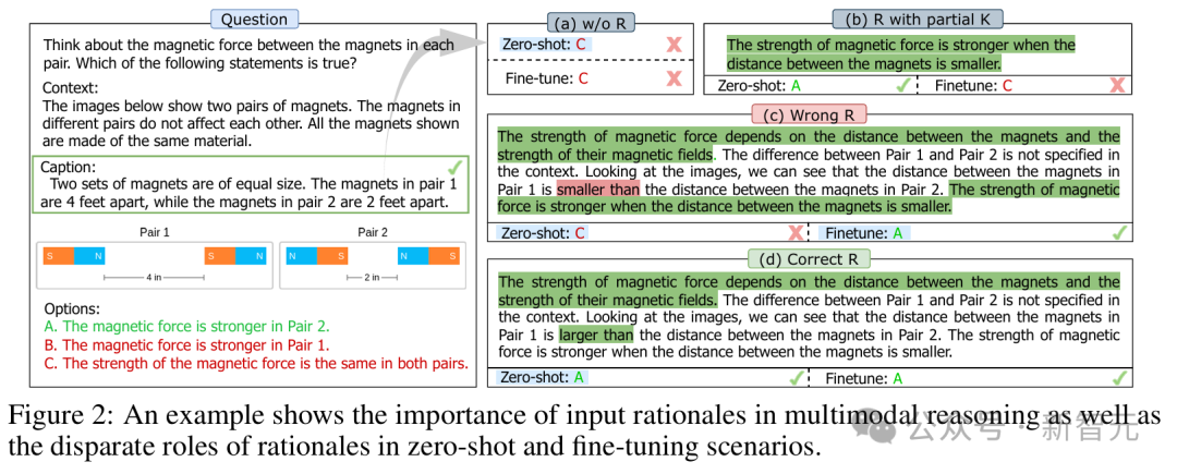 上面这道题,要求考虑每对磁铁的磁力,来判断以下陈述哪个是正确的。这个例子证明了,输入理由在多模态推理中是多么重要,以及理由在zero-shot和fine-tuning场景中的不同作用