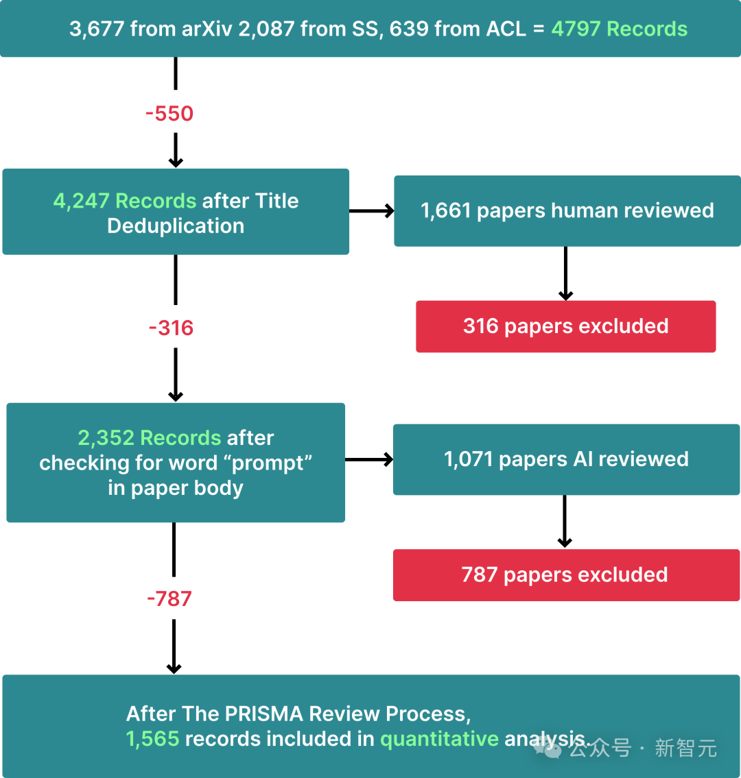 然后,根据论文标题进行去重,通过人类和AI审查确定相关性,并通过检查论文正文中是否包含「prompt」一词自动删除不相关的论文。