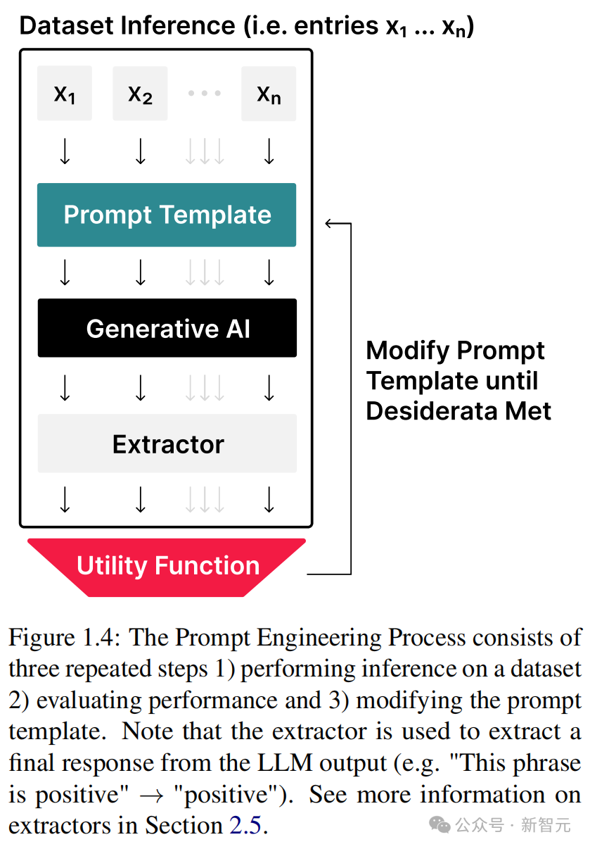 提示工程过程包括三个重复步骤:1)在数据集上进行推理,2)评估性能,3)修改提示模板。