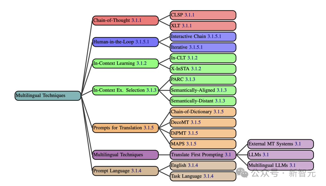 在多语种提示技术中,研究人员主要介绍了CoT、Human-in-the-Loop、上下文学习、上下文示例选择、翻译提示、多语种技术、提示语言这几大要点。