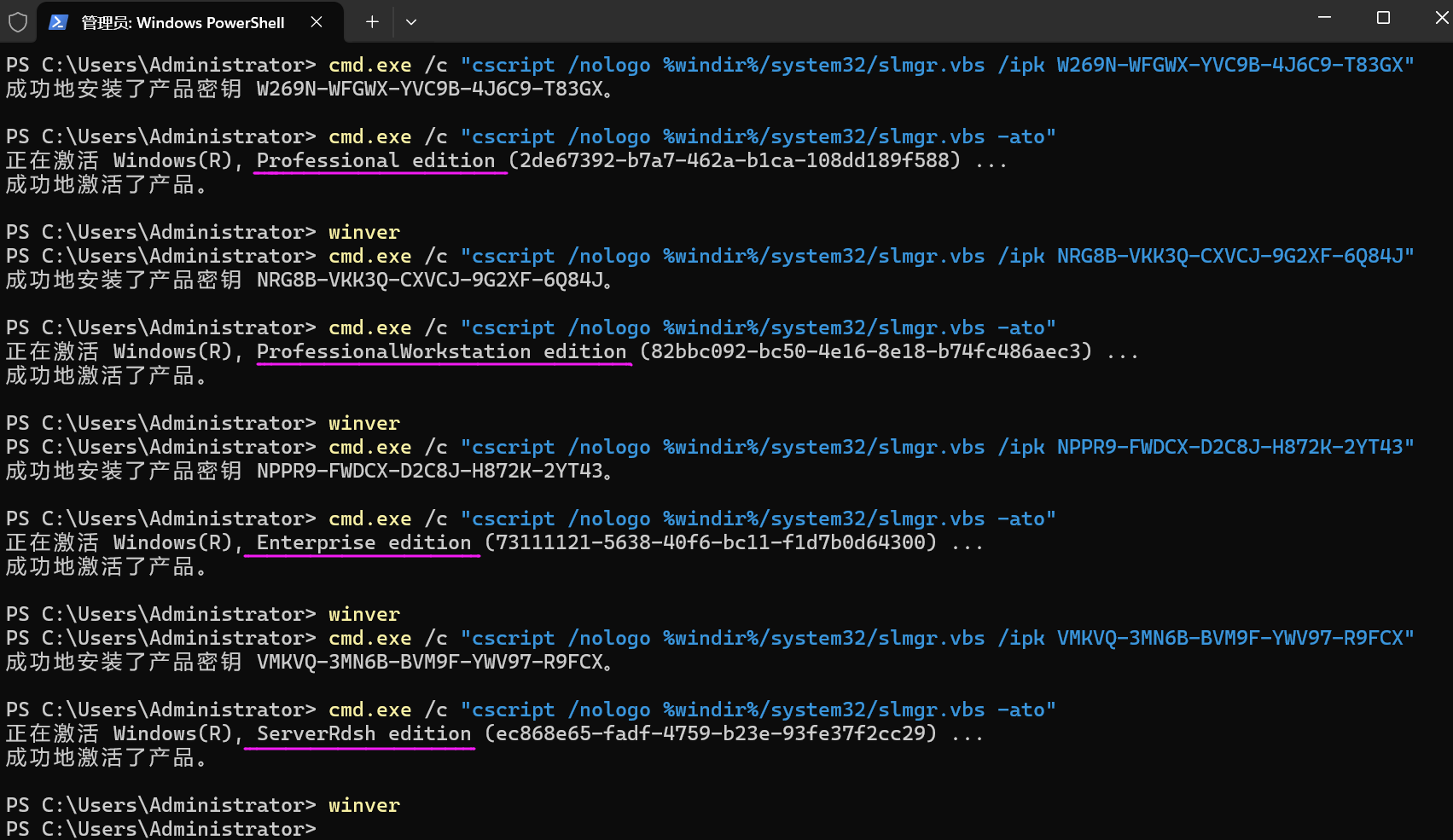 专业版、专业工作站版、企业版、企业多会话版/企业虚拟桌面版,可以通过ProductKey转化。
