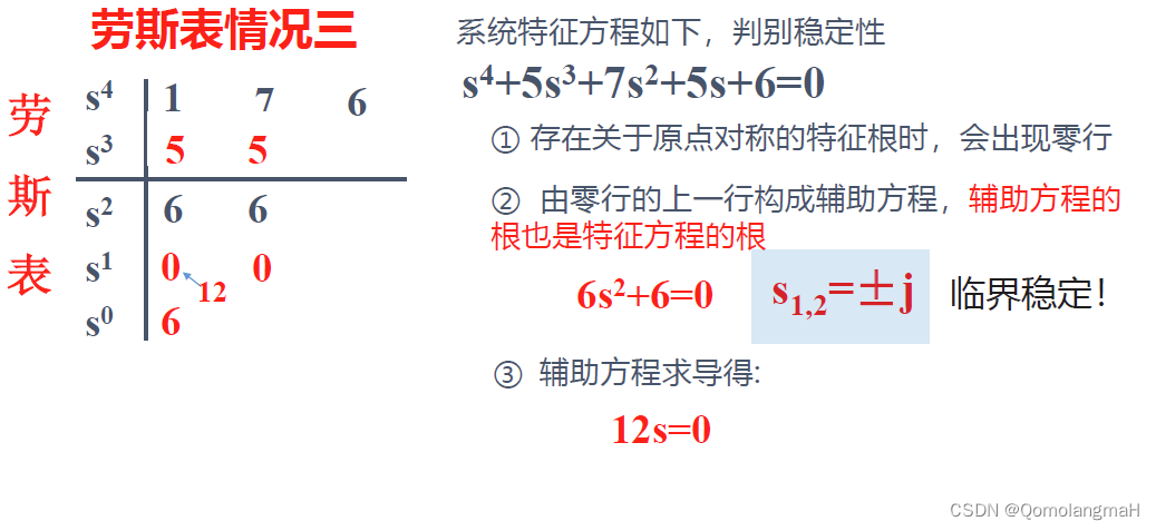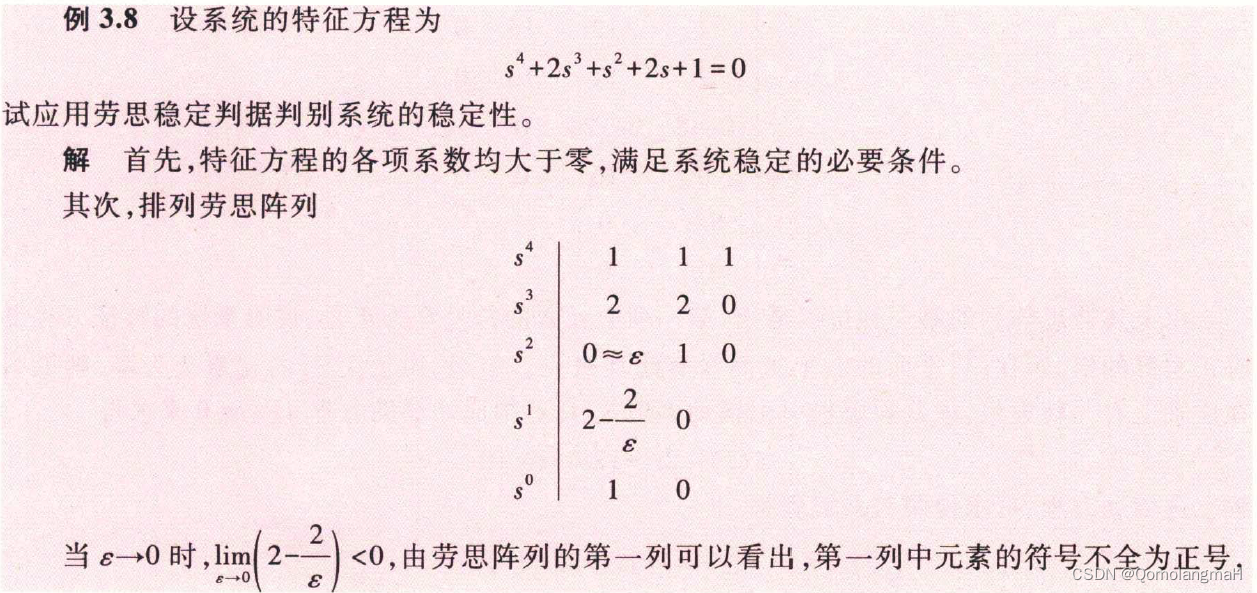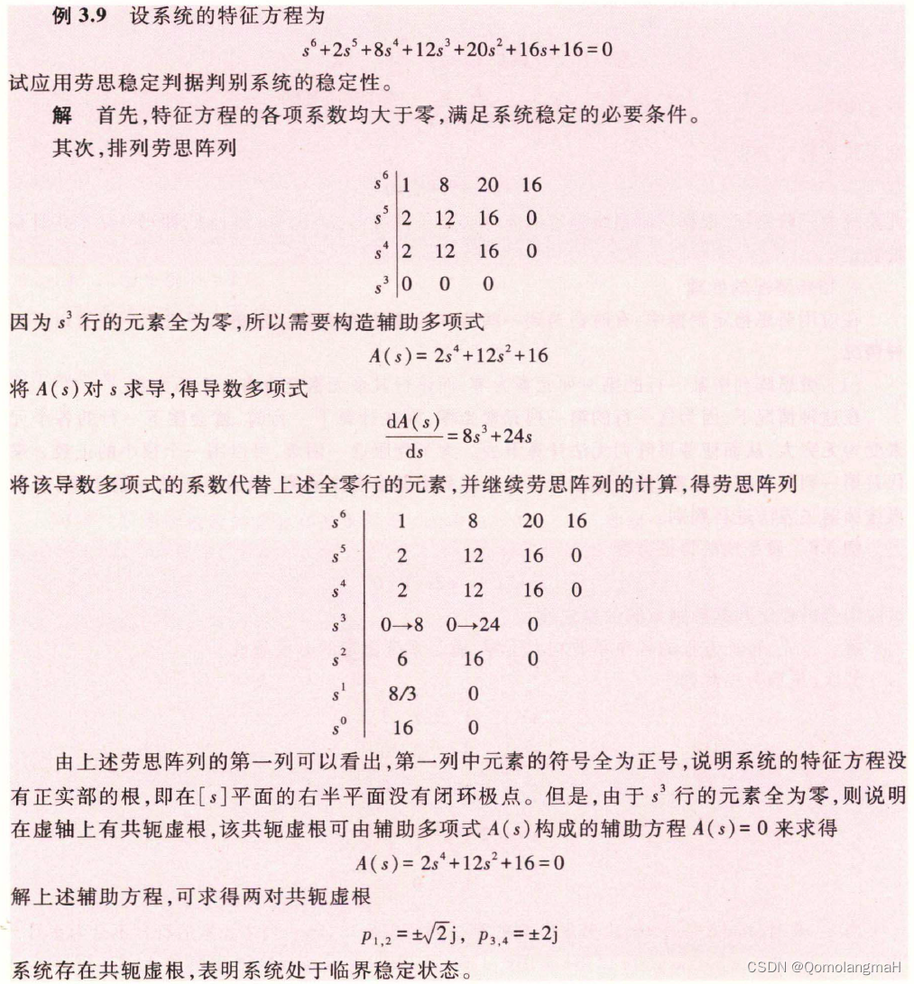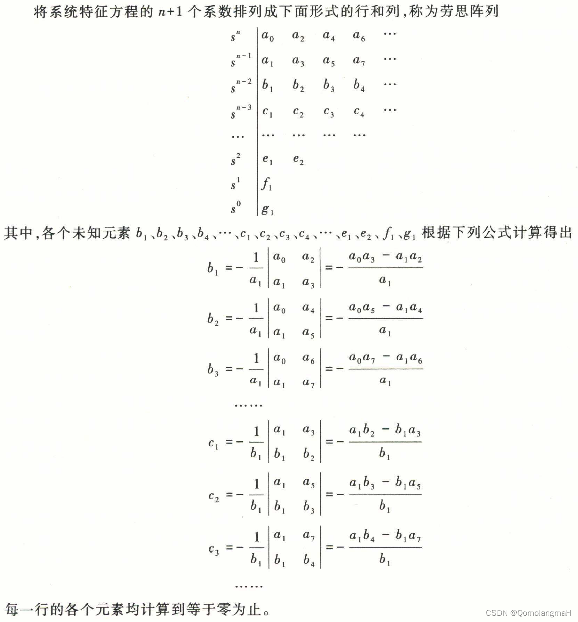 线性定常系统稳定的充分必要条件是其特征根全部具有负实部。因此,判别系统的稳定性,就要解出系统特征方程的根,并检验这些特征根是否都具有负实部。但是,通过直接求解特征方程,并根据其特征根来分析系统稳定性的方法是不方便的。于是,就提出了这样的问题,是否可以不用直接求解特征方程的根,而是根据特征方程的根与系数的关系去判别系统的特征根是否全部具有负实部,并以此来分析系统的稳定性。回答是肯定的,而且为此形成了一系列的稳定性判据,其中最著名的一个判据是 1877 年由 E.J.Routh 提出的判据,称之为劳思稳定判据。这种判据是基于特征方程的根与系数的关系,通过特征方程的系数来直接判别系统的稳定性。