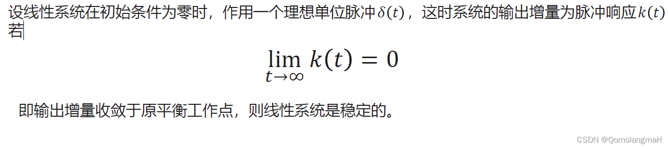 - 稳定性是分析不存在外作用,仅在初始状态影响下系统的时间响应,也称为零输入响应