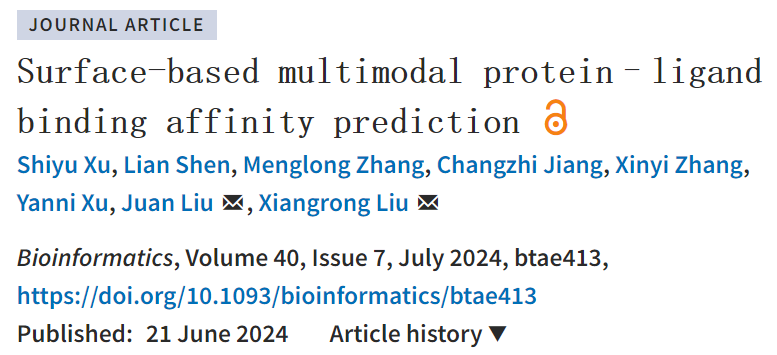 2024年6月21日,厦门大学刘向荣教授团队在Bioinformatics上发表文章Surface-based multimodal protein–ligand binding affinity prediction。