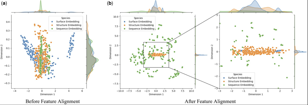 分析这两个子图的结果,可以发现,特征对齐前的可视化描述了节点在二维空间中的分散分布。具体而言,结构(橙色)嵌入和序列(绿色)嵌入节点倾向于沿维度1聚集,而沿维度2则呈现分散排列。表面(蓝色)嵌入节点更均匀地分布在两个维度上。经过特征对齐过程,这三类节点在二维空间内的集中度明显提高。值得注意的是,表面(蓝色)和结构(橙色)嵌入节点的空间密度大幅增加,这表明由于对齐,数据特征一致性得到了显著增强。由于序列(绿色)嵌入节点对应整个蛋白质序列的嵌入,蓝色和橙色节点分别对应蛋白质口袋的表面和结构嵌入,因此经过特征对齐后,绿色点更加弥散。然而,它们表现出向中心聚集的倾向。因此,分析表明,特征对齐可以提高模型处理和融合多模态数据的能力。