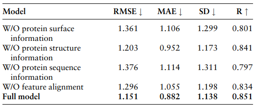 作者设计了消融实验来验证模型设计的有效性。MFE包括(a)结构特征提取(b)表面特征提取(c)序列特征提取(d)多模态特征对齐这四个模块。作者分别去除这四个模块中的一个,对比其与完整模型的结果,如表2所示。结果表明,当去除表面信息时,性能明显下降,表明表面信息在模型中的关键作用。同样,排除结构信息或序列信息都会导致性能下降,而消除序列信息会导致更显著的性能下降。这是因为序列信息包含了蛋白质的全局信息,这对于模型全面了解蛋白质至关重要。此外,在没有特征对齐的情况下,模型的性能会下降。这强调了特征对齐在处理多模态数据中的重要性,因为它有助于减少不同模态特征之间的异质性,从而提高模型有效整合不同模态特征的能力。