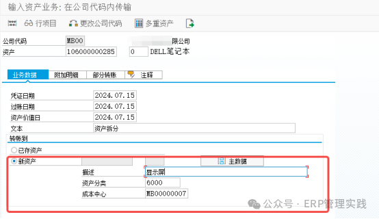 6. 点保存按钮,即完成资产在同一公司代码下的资产拆分过账。