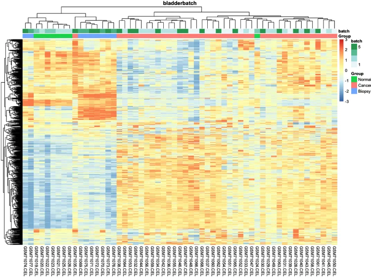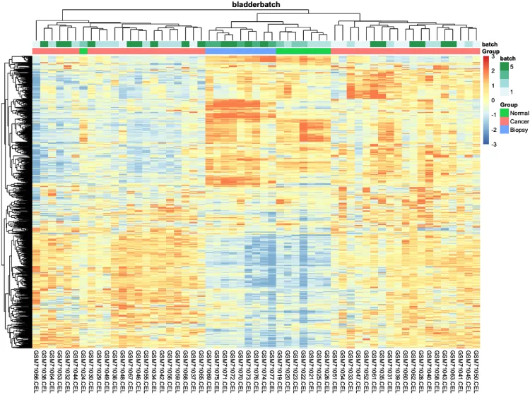 # 包含协变量 (mod=mod): 这里的模型矩阵 mod 包括了癌症状态(cancer),这意味着调整批次效应的同时也会考虑癌症状态的影响,以防止这些生物变量的影响被误当作批次效应调整掉。指定参考批次 (ref.batch=3): 在进行批次效应调整时,将第三个批次作为参照(基准),调整其他批次的数据以匹配这个参照批次的分布。这适用于当某个批次被认为是质量最高或最标准的情况。