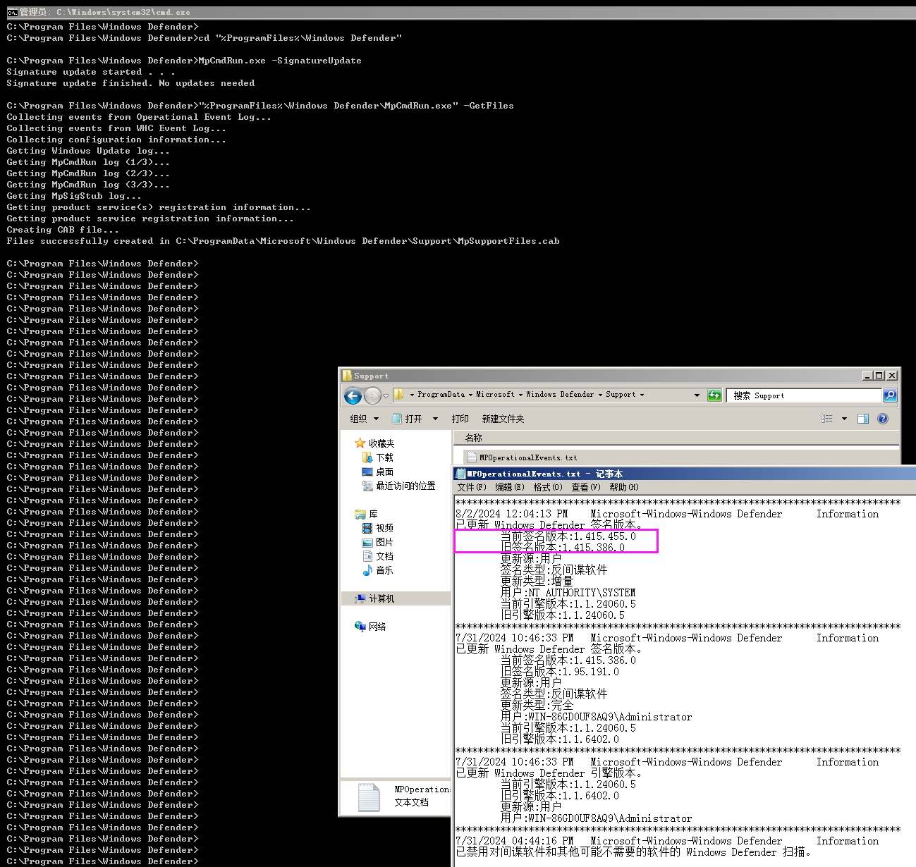 查看包版本的话,执行MpCmdRun.exe -GetFiles命令(先切换目录:cd "%ProgramFiles%\Windows Defender"),在C:\ProgramData\Microsoft\Windows Defender\Support\下面有个MPOperationalEvents.txt,打开可以看到相关版本的变化。