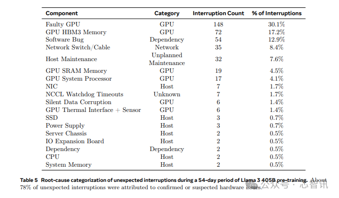 虽然 GPU 是最重要的组件,但恰好也很脆弱,但 41.3% 的意外中断是由多种因素引起的,包括软件错误、网络电缆和网络适配器。