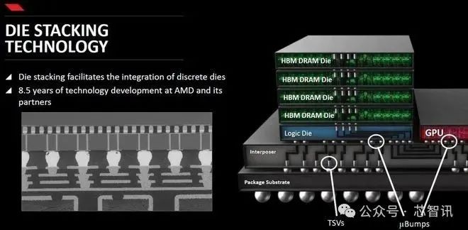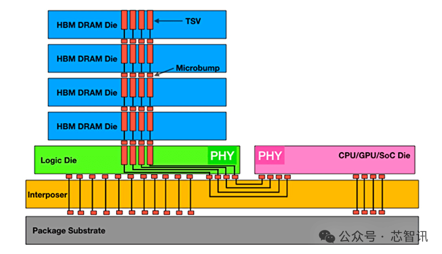 △HBM是将多个DRAM芯粒堆叠在一起,Die之间通过TVS硅通孔和Microbump连接。DRAM下面是则是DRAM逻辑控制单元, 对DRAM进行控制。CPU/GPU和DRAM堆栈通过uBump和Interposer(起互联功能的硅片)连通。Interposer再通过Bump和 Substrate(封装基板)连通到BALL。