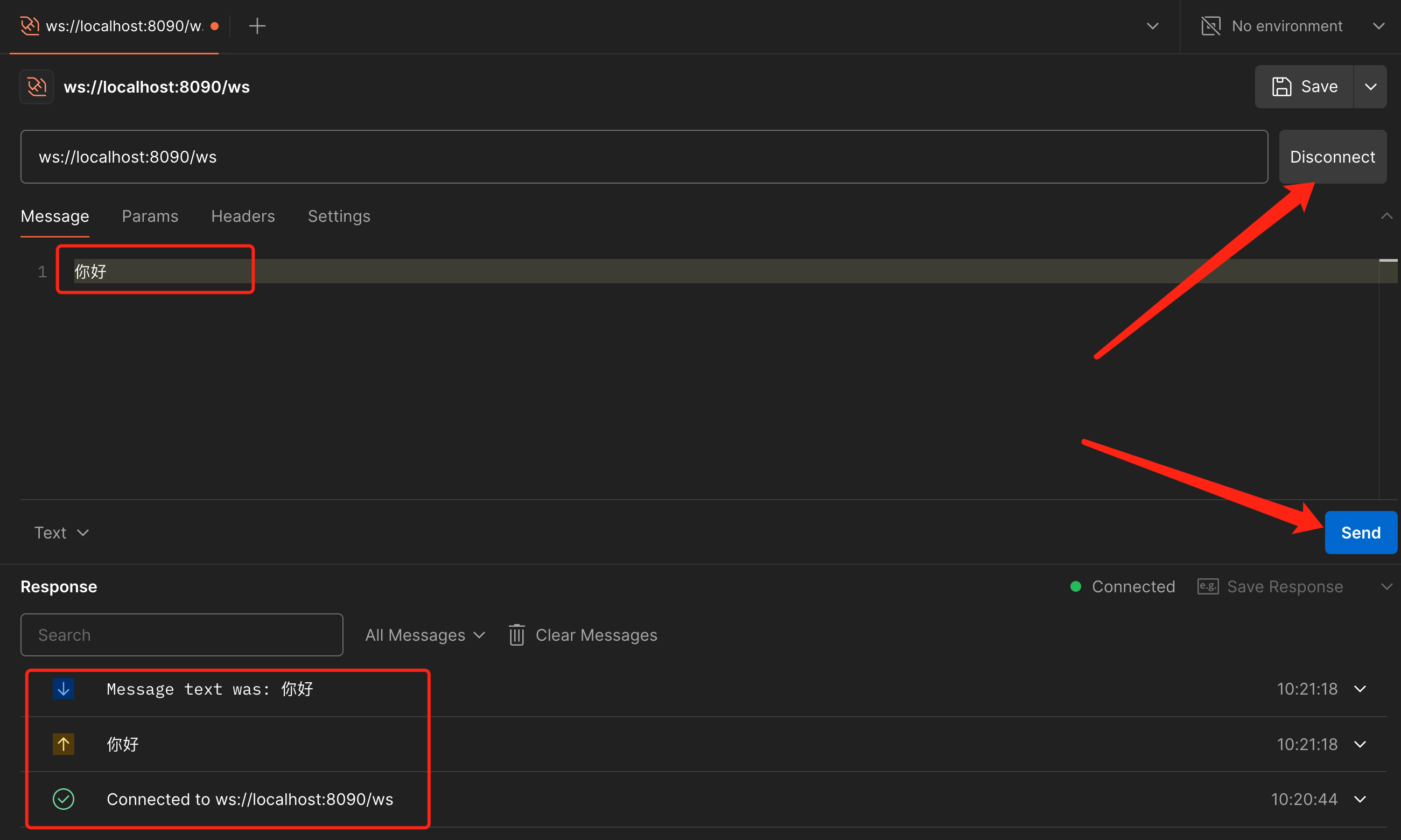 先点击 connect,再输入要发送的消息:你好。点击 send 即请求,响应了你好!