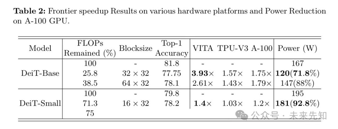 作者在三种类型的硬件平台上评估了剪枝模型的推理效率,包括速度提升和功耗降低,并在表2中总结了结果。首先,作者在支持各种块大小的GEMM的RISC-V平台ViTA [4]上模拟了ViTs的统计数据,这使得作者能够实现块稀疏模型的的理论速度提升。通过作者的方法,DeiT-Base和DeiT-Small分别获得了高达和的速度提升。然后,作者在高带宽平台Google TPU-V3 [25]上进行模拟。由于TPU V3只提供了一种固定为块大小的MAC,作者预计其速度提升不如RISC-V。尽管如此,对于DeiT-Base,作者仍然看到了正的速度提升。最后,作者在NVIDIA A100 40GB GPU上部署了模型,并使用CUDA 11.8评估了端到端推理时间和运行时功耗,观察到DeiT-Base的功耗降低了多达71.8%。功耗是通过在足够的时间段内平均nvidia-smi的功率计并减去空闲功耗来测量的。