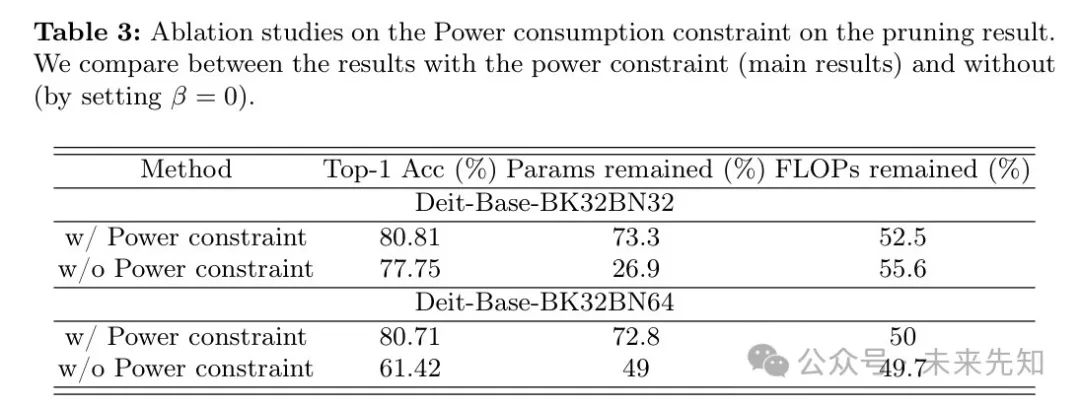 除了主要结果之外,作者还试图发现作者提出的剪枝方案中每个创造性部分如何对最终结果做出贡献,例如基本的-objective约束调节功率消耗和块稀疏结构,并回答诸如功率约束为何有利于性能等重要问题。作者在表3和表4中展示了详细的消融研究。
