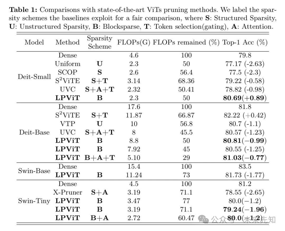 然而,对于主要由线性层(矩阵乘法)组成的 Transformer 架构,块结构化(半结构化)剪枝在准确性和硬件加速之间是一个更好的折中方案,因为GEMM以块对块的方式进行矩阵乘法。因此,在相同的剪枝比例下,与块稀疏矩阵的乘法可以实现比非结构化矩阵更快的加速,同时仍然保持高准确度。各种剪枝方案的定性比较总结在图1中。在NLP领域的先前研究[30, 37]在语言模型(BERT[11],MobileBERT[42]等)上验证了块结构化剪枝,实现了超过的速度提升,且性能下降可以忽略不计。然而,它们的其他剪枝方案相对过时,例如,普通的剪枝标准。在ViTs上进行类似尝试以应对各种视觉任务的研究仍然很少。