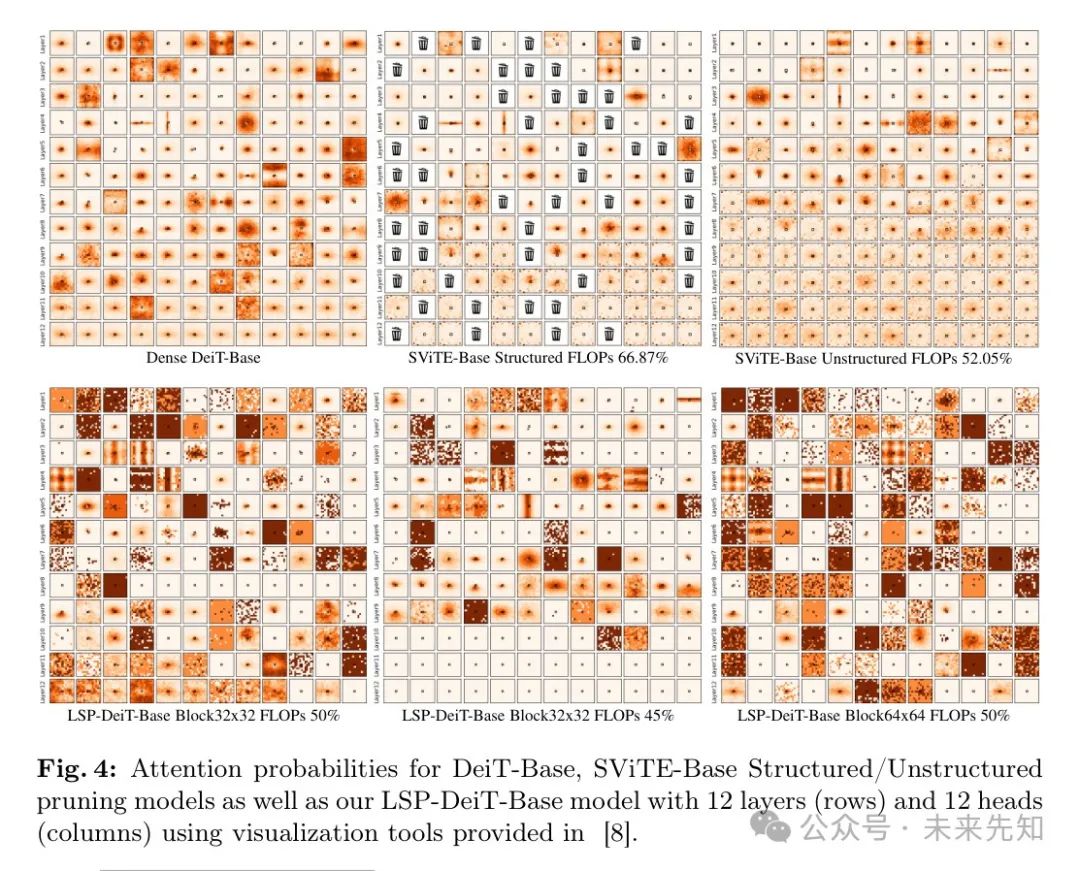图4:使用文献[8]中提供的可视化工具,展示了DeiT-Base、SViTE-Base结构化/非结构化剪枝模型以及作者的LSP-DeiT-Base模型(12层和12个注意力头)的注意力概率。
