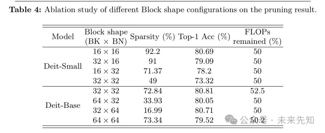 块结构配置。作者的优化方案如何适应不同的块大小配置对于在不同的硬件平台上,具有不同并行度的一般化至关重要。因此,作者进行了消融研究,变化不同的块形状组合,如表4所列。首先,作者观察到较小的块大小保留了更多的模型准确度。其次,作者注意到较小的网络对于块形状的变化更为敏感,不同的块大小导致网络中剩余参数数量的剧烈变化。
