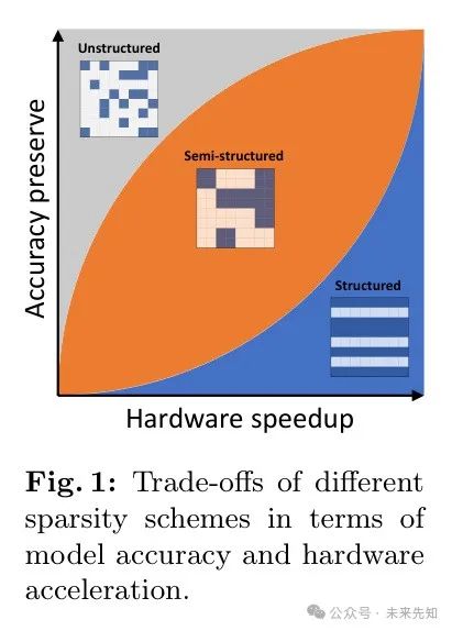 图1:不同稀疏方案在模型准确性和硬件加速方面的折中。