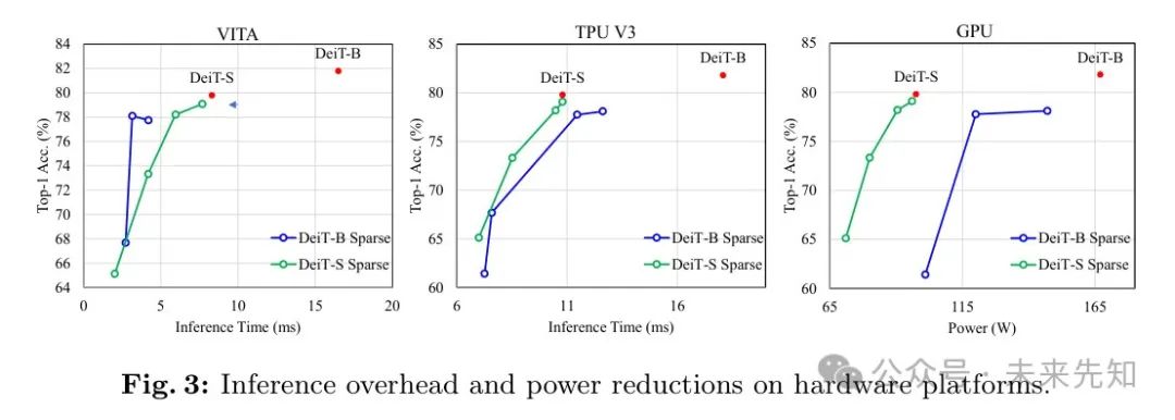 图3显示了将模型剪枝到不同大小时的结果,即不同剪枝水平下的推理时间和准确度。具体来说,每个点代表特定剪枝配置的一个结果。在图3中,作者观察到在VITA上,DeiT-B比DeiT-S获得了更好的权衡,而在TPU和GPU上,DeiT-S表现更好。这表明不同的硬件平台上,模型的表现可能会有所不同。