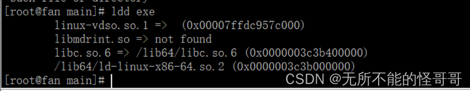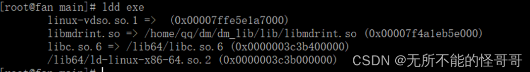 不管使用上面三种方法的哪种,都可以使动态库正常加载到可执行文件中,我们再次使用 ldd 命令查看 exe 文件,可以看到,我们的动态库 libmdrint.so 后面由原来的 “not found” 变成了一个路径,这说明加载器现在可以找到动态库的路径了,可执行文件 exe 也就可以运行了。