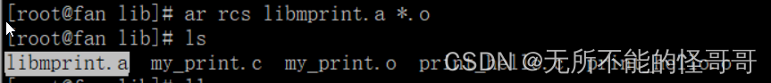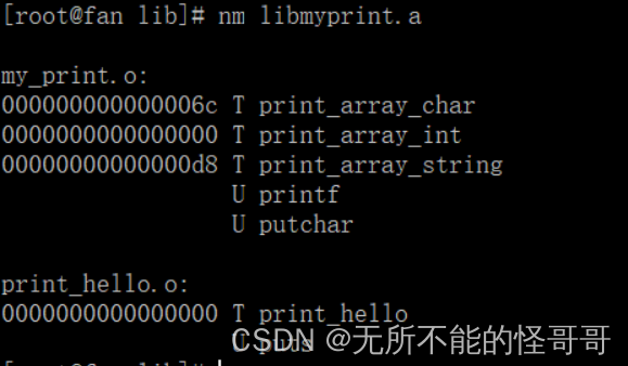 我们可以用 nm 命令查看库文件的信息,可以看到它是由 my_print.o 和 print_hello.o 生成的。