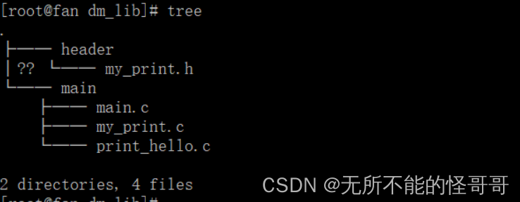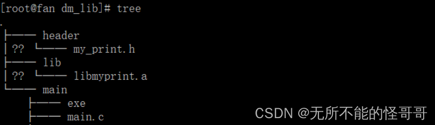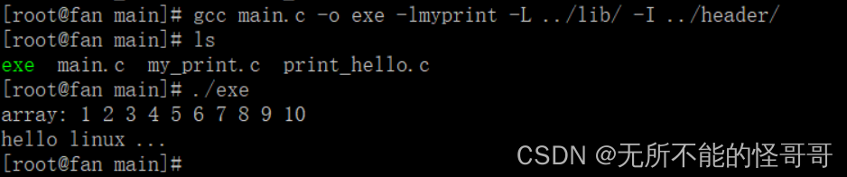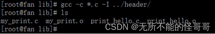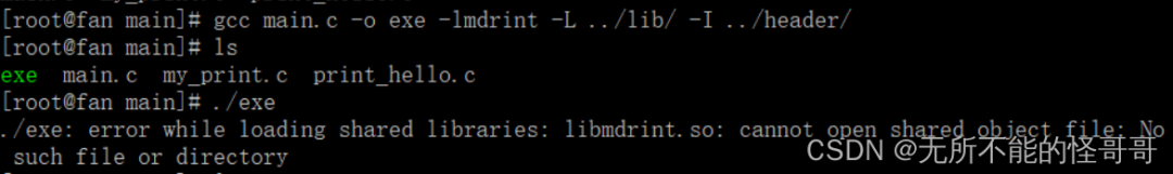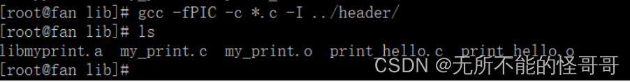 首先对上面的命令进行分解一下,-lmyprint 用于指定链接库的名字,我们上面生成了一个名为 libmprint.a 的静态库,把前缀后缀去掉留下中间的名字即可;-L …/lib/ 指定静态库的搜索目录,不指定的会,编译器只会去默认的链接库搜索路径寻找;-I …/header/ 这个就比较熟悉了,指定头文件的路径。