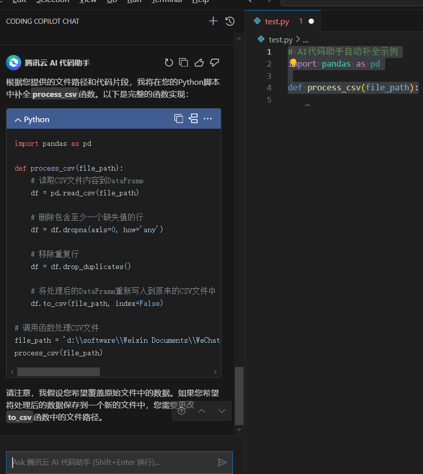 在编写数据处理模块时,AI代码助手的代码补全功能显著提高了编程效率。例如,在处理CSV文件时,只需输入几个字符,助手便能智能提示出完整的代码段,减少了手动编写代码的时间。