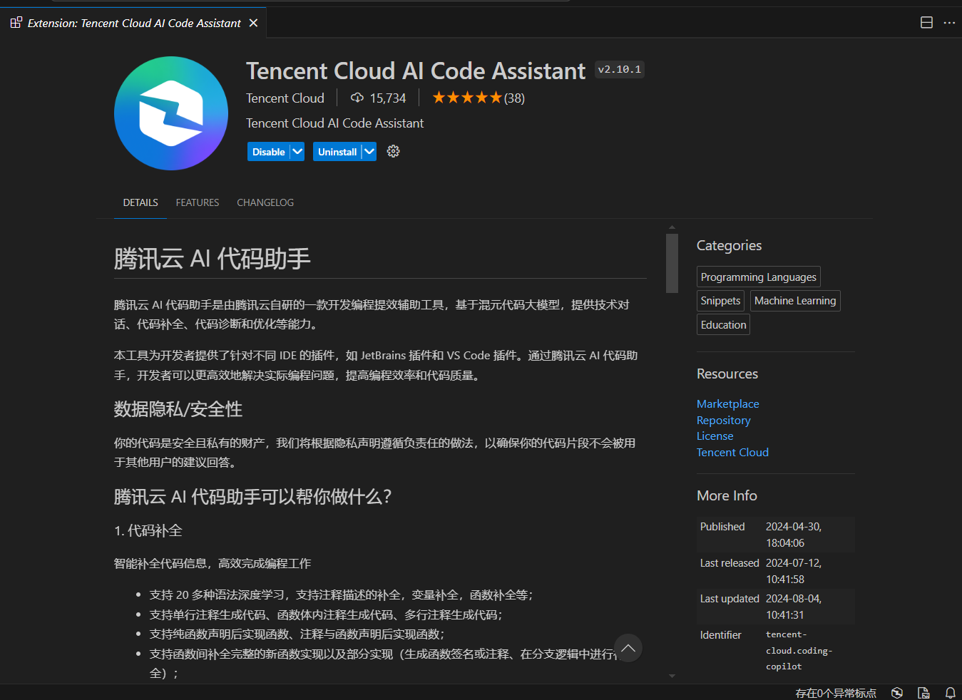 此次项目开发中,我使用Python语言,开发环境为Ubuntu 20.04 LTS。使用Visual Studio Code (VSCode) 编辑器并安装腾讯云AI代码助手插件。VSCode提供了多种编程语言支持和丰富的插件生态系统,结合腾讯云AI代码助手,大大提升了开发效率和代码质量。