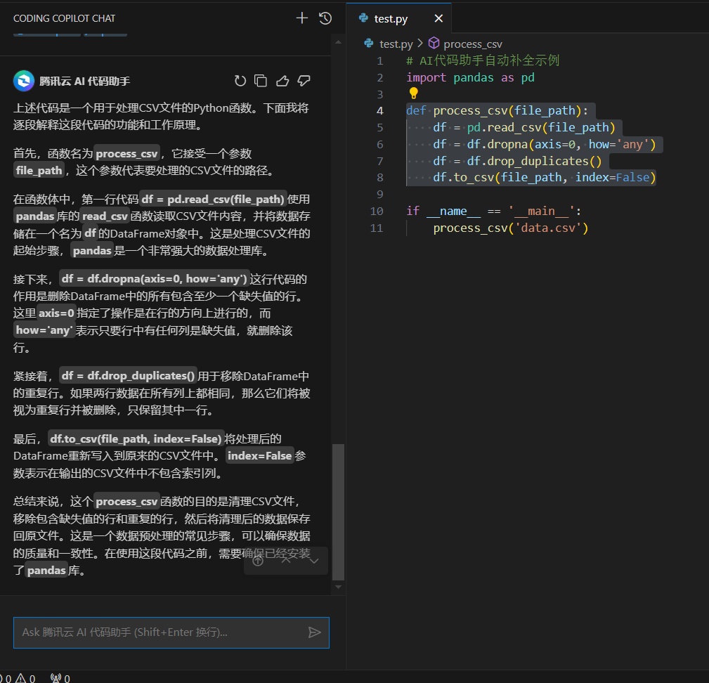 process_csv(file_path)当遇到技术难题时,AI代码助手的技术对话功能提供了极大的帮助。我通过自然语言与助手交流,获得了相关技术文档和代码示例。例如,在处理CSV文件时,助手根据我提供的代码解释了各段代码的含义。