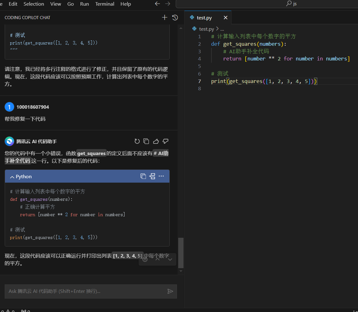 print(get_squares([1, 2, 3, 4, 5]))在测试阶段,项目中出现了一些难以定位的Bug。AI代码助手通过智能调试功能,帮助我快速定位并修复这些问题。例如,在下面数据处理函数中,助手指出了数据类型转换错误并给出了修复建议,保证了项目的稳定性。