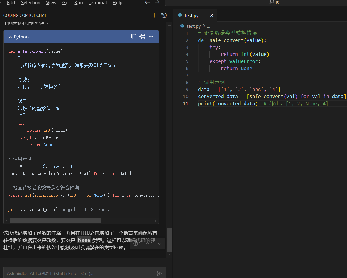 print(converted_data) # 输出: [1, 2, None, 4]腾讯云AI代码助手在我的开发工作中发挥了多方面的作用,带来了以下几种主要提升: