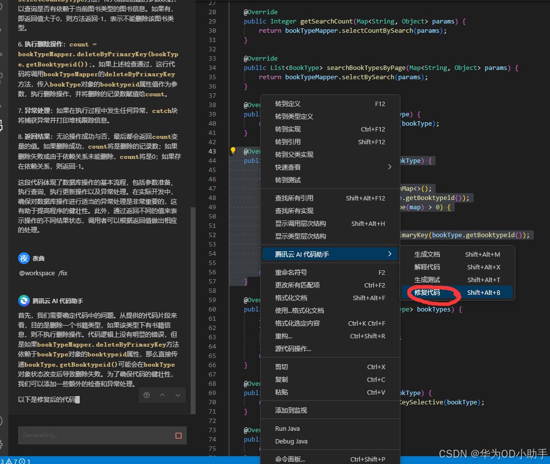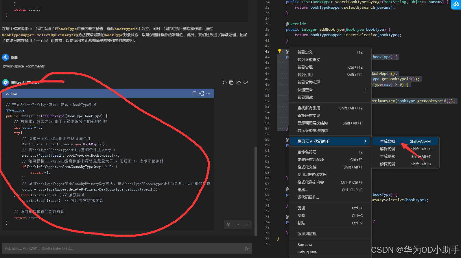 我们平时在写代码的时候一般都会在关键逻辑上加注释,可加注释又是一个比较繁琐的事,很多时候都会懒得写,导致团队其他同事拿到项目也很头疼。现在我利用腾讯云AI代码助手可以一键添加,直接帮我节省了很多时间。可以看到下图中点击生成文档,AI助手会给每一行代码都添加注释。