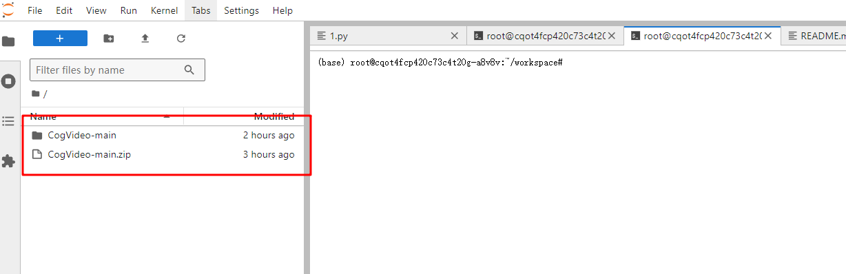 进入JupyterLab后,打开终端,首先输入git clone https://github.com/THUDM/CogVideo.git,拉取CogVideo代码的仓库,如遇到github连接超时,可以使用本地下载压缩包然后上传到服务器解压,拉取成功后会显示CogVideo-main的文件夹如下: