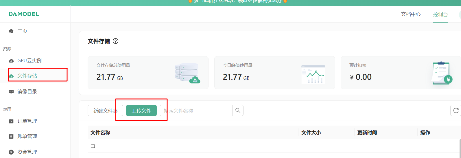 然后点击丹摩控制台-文件存储-上传文件,将刚刚下载好的整个CogVideo文件夹上传,上传好后的文件存在实例的/root/shared-storage目录。