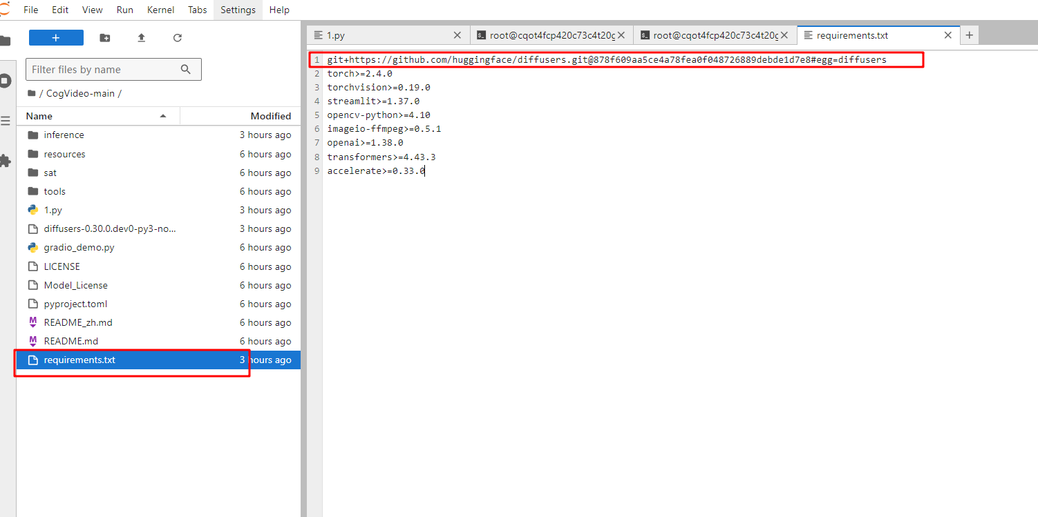 其次,cd进入CogVideo-main文件夹,输入pip install -r requirements.txt安装对应依赖:
